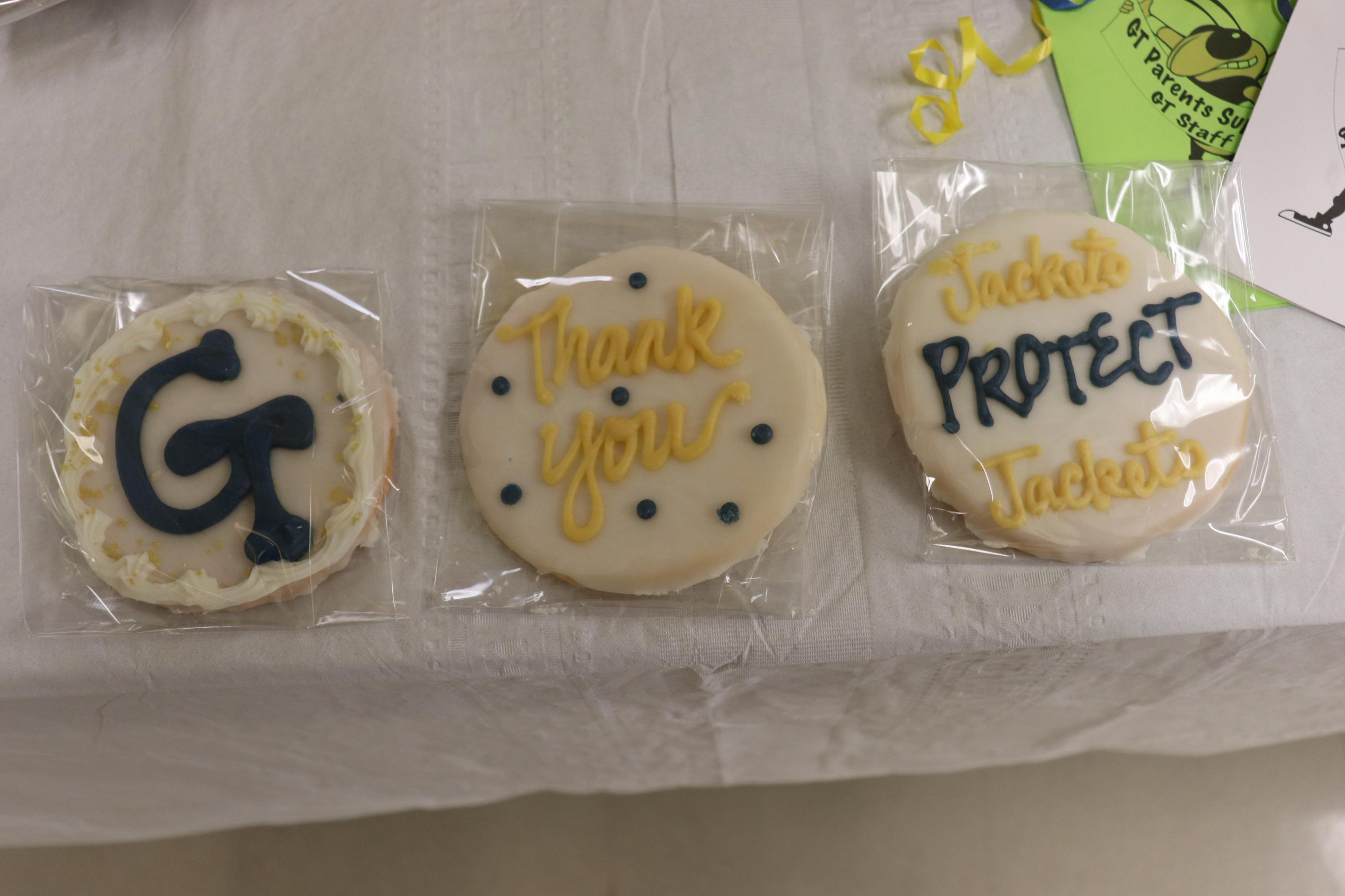 Cheryl Kelley, assistant to the Vice President, coordinated with the Georgia Tech parent group who were mostly from the New England area. Those parents reached out to local Tech parents and confirmed a day and location for the delivery of hundreds of bottles of water and sports drinks, individual snacks, fruit and pastries. Cookies iced with the GT logo, the words "Thank You" and even the "Jackets Protect Jackets" tagline were a personal and thoughtful touch. In addition, individual thank you cards were available for staff to pick up as they made their way down a buffet of goodies.