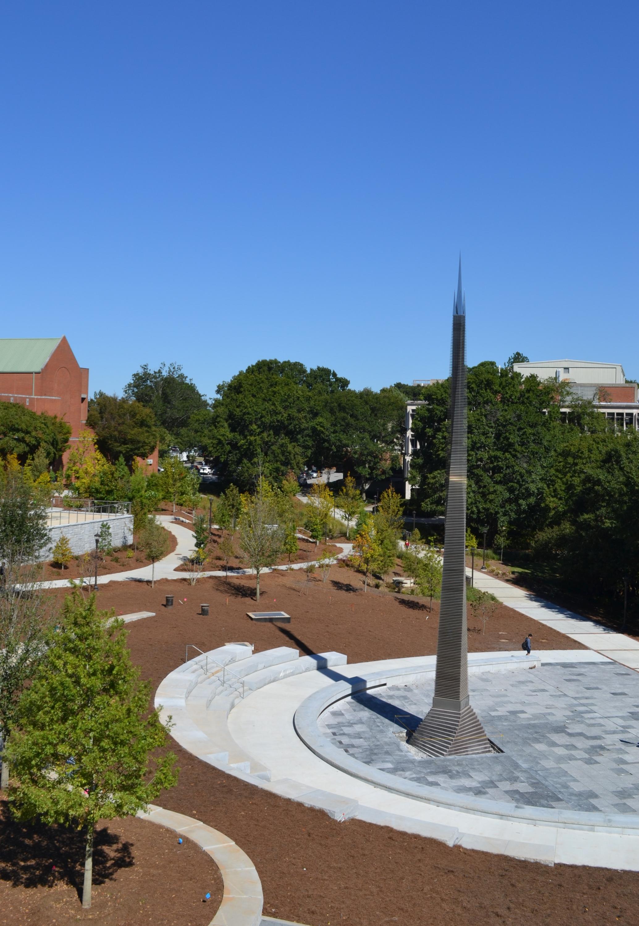 The Kessler Campanile has long served as an iconic campus landmark. This landmark and the surrounding plaza, fountain, and amphitheater have been reconfigured as part of the Campus Center construction and renovation project. The most notable change is the design of the fountain at the base of the 80-foot obelisk. During the planning and design process, students were instrumental in the decision to keep the water feature as an integral part of the design.