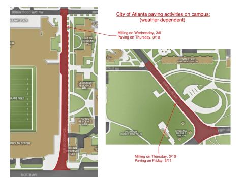 The City of Atlanta will shut down Techwood Drive between North Avenue and Bobby Dodd Way between 9 a.m. and 4 p.m. on Thursday, March 10, and Friday, March 11, to repave the roadway and apply temporary striping.